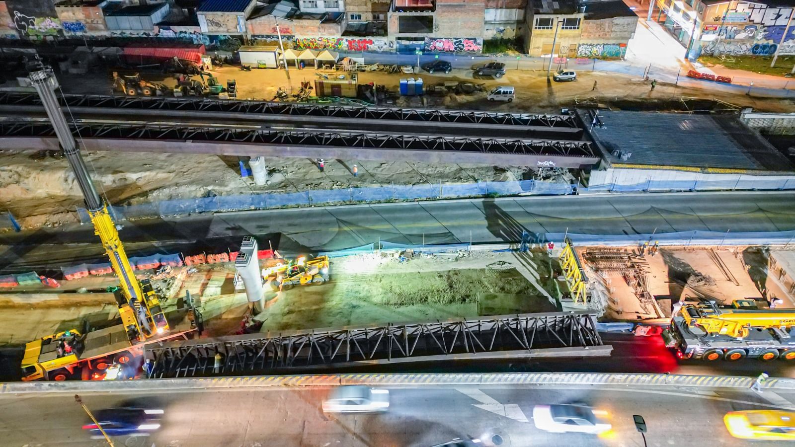 “Estamos en el grupo 1 del corredor de la 68, en los puentes de Venecia. Estamos izando la viga cajón número 14, una viga de 31 m de largo, más de 55 toneladas. Falta una, que estará izada esta noche, una viga de más de 38 m, y más de 50 toneladas también. Con esa viga completamos todo el sistema de vigas cajón y empezamos a fundir las placas, informó Orlando Molano, director del IDU.